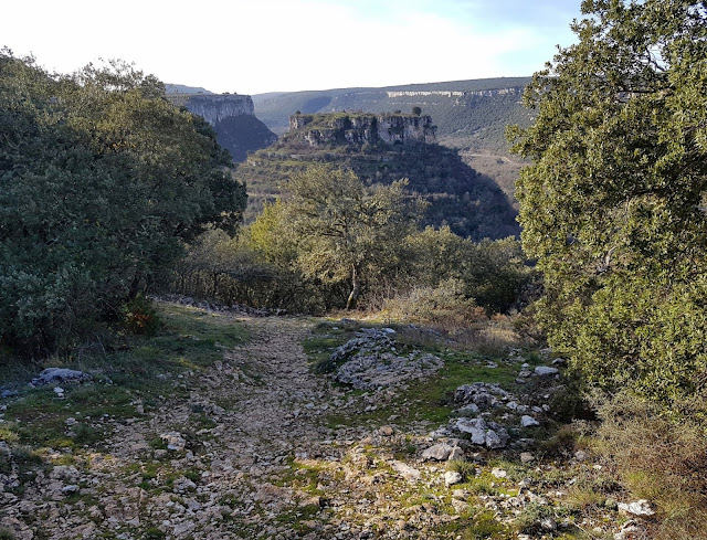 Como sabemos, este camino desciende por la derecha hacia el fondo del cañón, donde se encuentra Valdelateja, pero nos preguntamos si es posible recorrer el meandro seco que rodea la peña de Siero, también llamada Castrosiero. En los mapas, aparecen antiguos caminos, que nos incitan a su exploración. La vegetación no obstante, parece que lo ha invadido todo y hay dudas sobre su viabilidad.